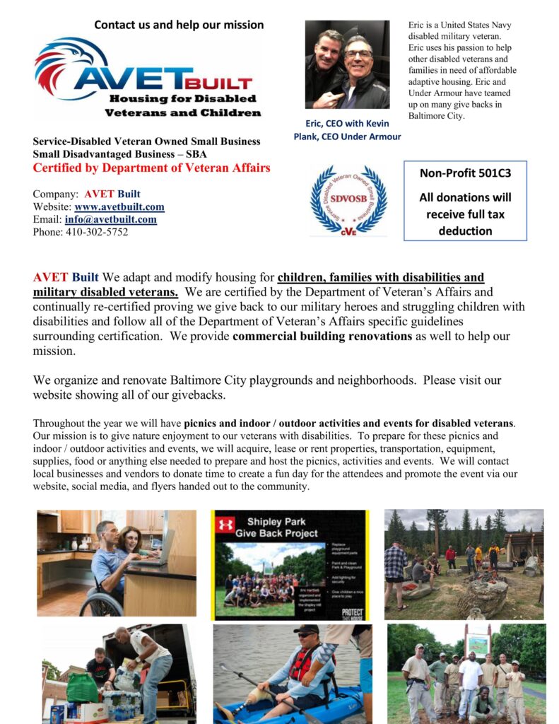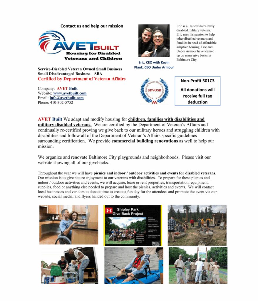 My dad and I started AVET BUILT, a non profit to help Veterans and Families-in-need mostly in Maryland, with a desire to help families all across the United States soon. We offer free moving help, cash to help families move, free realtor services, donations like furniture, vehicles, and more. This is self-funded and operated, and sometimes we get donations to help contribute, but we LOVE giving back to these families, they deserve the world!Another Way I LOVE giving back to the community